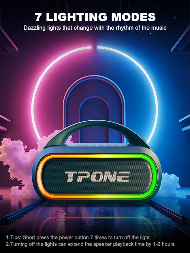 - 【Advanced Bluetooth & Powerful Battery】Equipped with the latest Bluetooth 5.3 chip, it ensures fast pairing and stable connection, and automatically reconnects to the last used device. Each charge can experience up to 12 hours of game time, let us enjoy the music day and night, The multicolor lights on the speaker can also be turned off with a simple button press to save the battery and adapt to your needs. Keep in mind that the actual play time may vary depending on the volume, audio content, and usage.