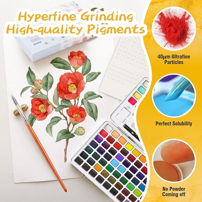 - 【Upgraded 40μm Hyperfine Grinding Pigments】The colors are bright, rich, transparent, soluble, easy to color, easy to blend, create endless colors when mixed together, have excellent fluid, natural watercolor blooming effect.