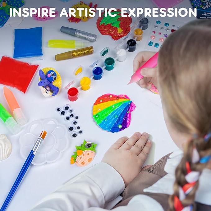 - Super Value Paint Set - This kids activities crafts includes 12 real seashells, 8 standard paints, 2 glitter glues, 4 glow-in-the-dark paint, 5 modeling clays, 10 paris of eyes stickers, gem stickers, 10 adhesive sticky, paint tray, brushes and instruction - all-in-one kit for fun