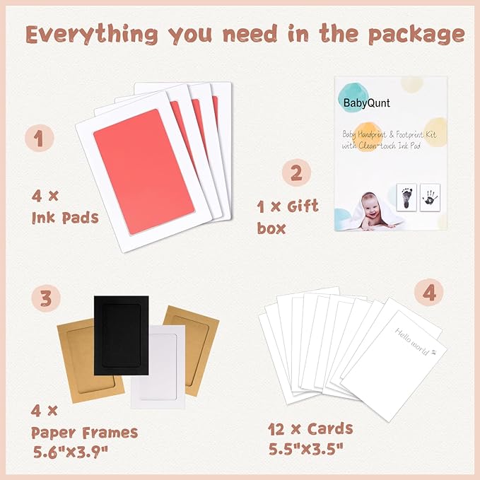 - 【Product Details】: Our baby hand and footprint kit measures 6.0"x4.2" with an ink window of 4.9"x3.1", which is the best size for recording hand and footprints of newborns 0-6 months old or pet paw prints . The ink pad for baby hand and footprints includes 4 clean touch ink pads, 12 stamping cards, and 3 display frames, ensuring you have ample opportunity to capture the best stamp.