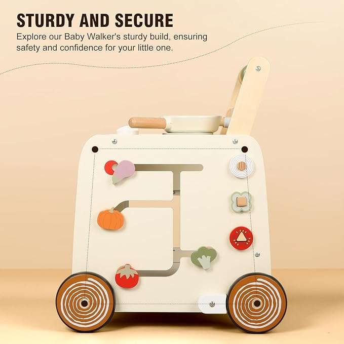 STURDY AND SECURE DESIGN: Made from durable wood with anti-slip rubber wheels, this wooden baby walker provides a stable and secure platform for your child's early exploration.