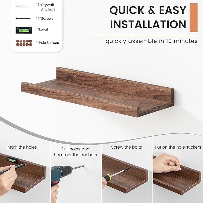 - 【Easy to Install】FLYJOE picture ledge shelves are quick and easy to install! Each set comes with pre-drilled holes and all necessary hardware, including a mini level for perfect alignment. With simple instructions, you can have your shelves up in minutes, allowing you to start decorating right away