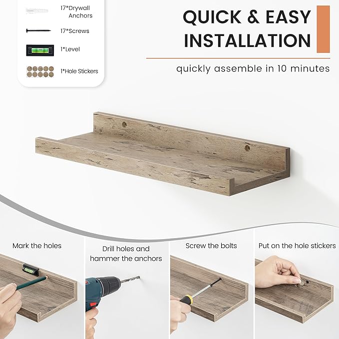 - 【Easy to Install】FLYJOE picture ledge shelves are quick and easy to install! Each set comes with pre-drilled holes and all necessary hardware, including a mini level for perfect alignment. With simple instructions, you can have your shelves up in minutes, allowing you to start decorating right away