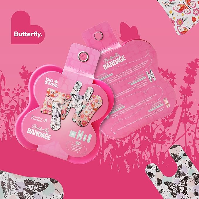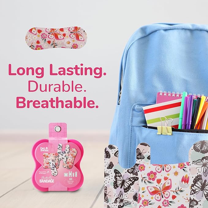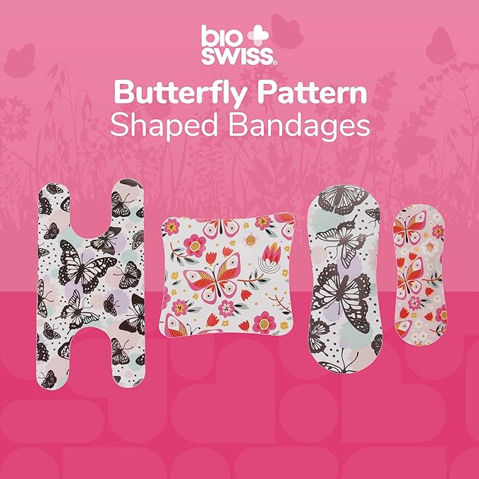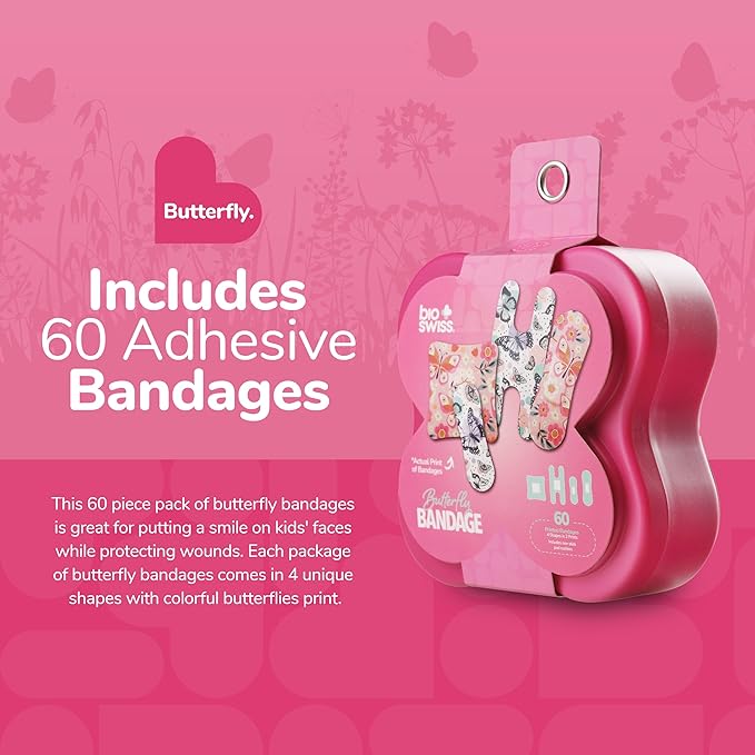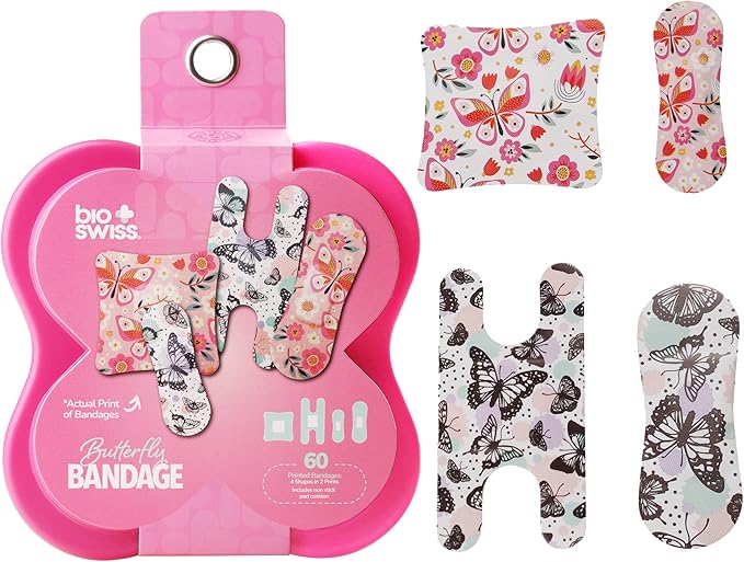 BioSwiss Bandages, Assorted Size Butterfly Print Self Adhesive Bandage, Latex Free Sterile Wound Care, First Aid Kit Supplies for Kids and Adults, 60 Count