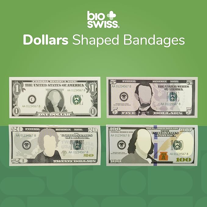BioSwiss Bandages, Money Shaped Self Adhesive Bandage, Latex Free Sterile Wound Care, Fun First Aid Kit Supplies for Kids, 50 Count