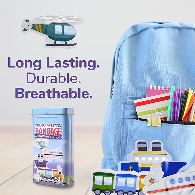 - TRANSPORTATION BANDAGES: This 50 piece pack of adorable vehicle shaped bandages is great for putting a smile on kids' faces while protecting wounds such as cuts, scrapes, and burns and comes in an assortment of boat, airplane, train, and helicopter shapes; sticky bandages are perfect for kids and adults alike, and also for school nurses and pediatric doctors