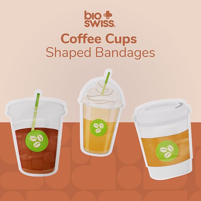 BioSwiss Bandages, Coffee Cup Shaped Self Adhesive Bandage, Latex Free Sterile Wound Care, Fun First Aid Kit Supplies for Kids, 50 Count