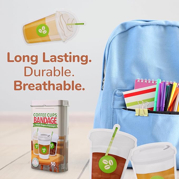 - COFFEE BANDAGES: This 50 piece pack of adorable coffee cup shaped bandages is great for putting a smile on kids' faces while protecting wounds such as cuts, scrapes, and burns; sticky bandages are perfect for kids and adults alike, and also for school nurses and pediatric doctors