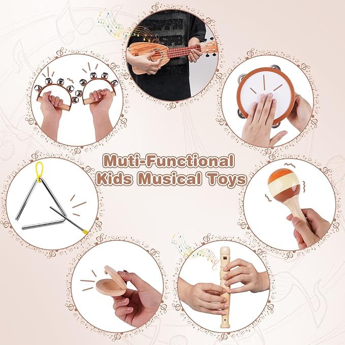 - Educational Montessori Toys: As an early development toy set, toddler can develop their sense of hearing and touch by playing with these musical instruments, which help to develop their sensitivity to music and sense of rhythm, and improve their creativity and ability to recognize musical instruments.