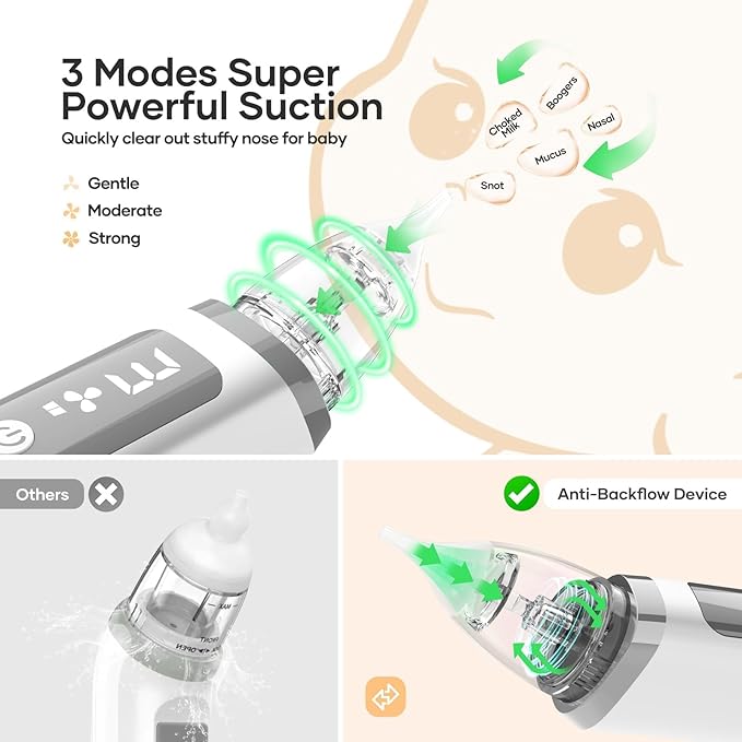 - 3 LEVELS OF SUCTION MODES - The nasal aspirator for baby has three levels of adjustable suction modes from weak to strong, quickly removes different types of nasal secretions (Choking milk, snot, etc)