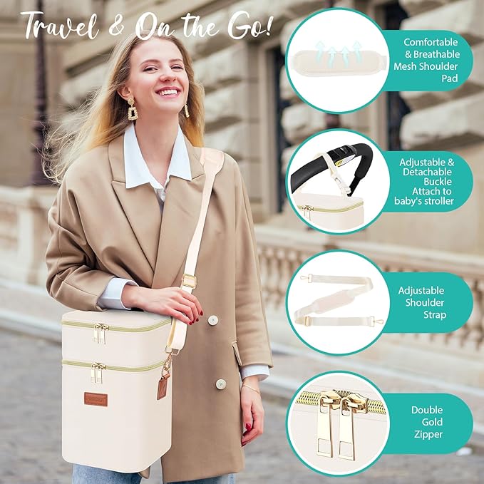 - Breastfeeding On The Go for Moms: The Top adjustable & detachable buckle can easily attach to the baby's stroller, and the adjustable shoulder strap with a soft pad keeps your shoulders comfortable, release your hands, and easy to carry or transport when you have a picnic, traveling, shopping, or take an airport. A must-be baby essential gift to working moms or busy women stores breastmilk for nursing babies.