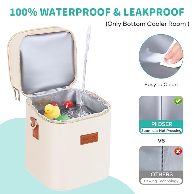 - Double Layer & Dual Compartment Design: The bottom cooler room with an ice pack that will keep breastmilk, drinks, or baby food fresh for hours. And it can fits 4 large baby bottles up to 9 ounces. The top compartment layer provides some space and you can breastmilk storage bags, baby squeeze pouches, baby snack container box or baby food storage jars...