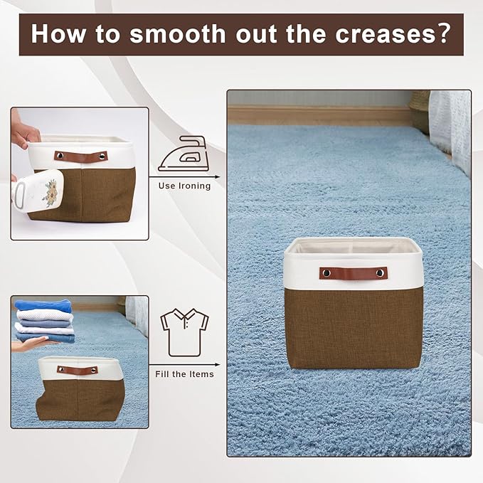 - 【Maintenance & Care Tip】 - Collapsible design for space saving. Our foldable baskets comes in a compression packing which may result in wrinkled storage bin during the long transit. Get rid of the wrinkles by either stuffing the fabric storage bins with blankets and pillows for a few days or steam iron them at low-heat setting. The organization baskets are easy to clean, you can dust the basket with a soft cloth with light soapy water when needed. Not recommended to machine wash.