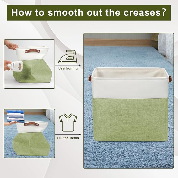 - 【Maintenance & Care Tip】 - Collapsible design for space saving. Our foldable baskets comes in a compression packing which may result in wrinkled storage bin during the long transit. Get rid of the wrinkles by either stuffing the fabric storage bins with blankets and pillows for a few days or steam iron them at low-heat setting. The organization baskets are easy to clean, you can dust the basket with a soft cloth with light soapy water when needed.