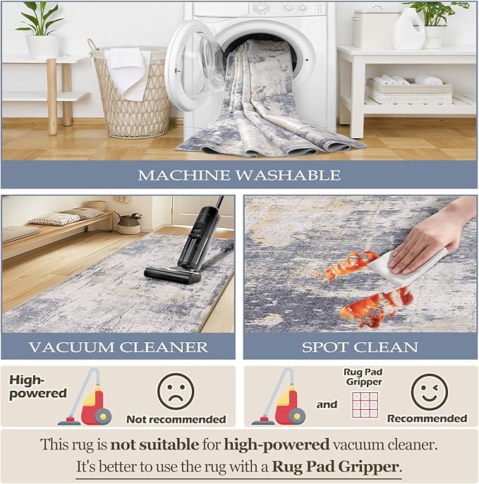 - Tides Series – Effortless style that flows with your life.This modern machine-washable non-slip rug features reinforced edges and a low-pile design that resists dirt. Its water-repellent surface makes spills easy to clean - liquids bead up for quick wiping. Simply machine wash in cold water (no bleach) to refresh. The non-slip backing keeps it securely in place. A perfect blend of function and contemporary design for active homes.
