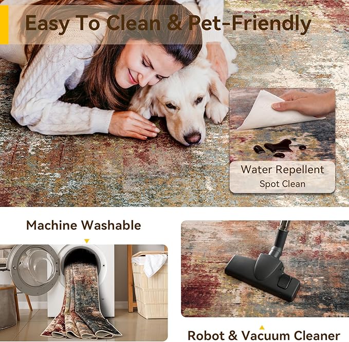 - Tides Series – Effortless style that flows with your life.This modern machine-washable non-slip rug features reinforced edges and a low-pile design that resists dirt. Its water-repellent surface makes spills easy to clean - liquids bead up for quick wiping. Simply machine wash in cold water (no bleach) to refresh. The non-slip backing keeps it securely in place. A perfect blend of function and contemporary design for active homes.