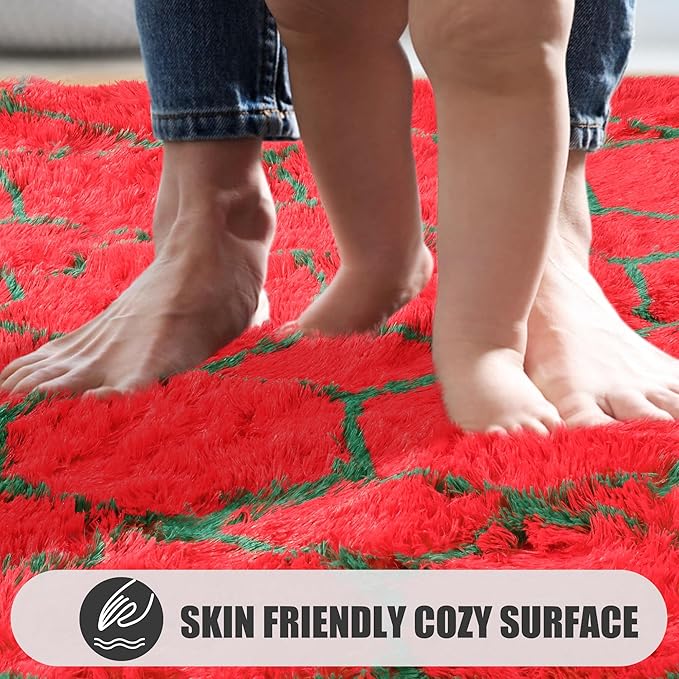 ONASAR 6x9 Area Rugs for Living Room, Large Fluffy Red and Dark Green Bedroom Rug, Geometric Boho Soft Shaggy Plush Floor Carpet for Kids Girls Teen Nursery Dorm Christmas Home Decor Aesthetic