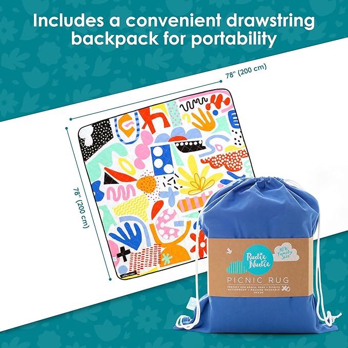 - Playful Pop Pip Pow design: The Pop Pip Pow picnic rug, combines playful patterns with vibrant colors that have made it a customer favorite. This fun and eye-catching design adds a lively touch to any indoor or outdoor setting.