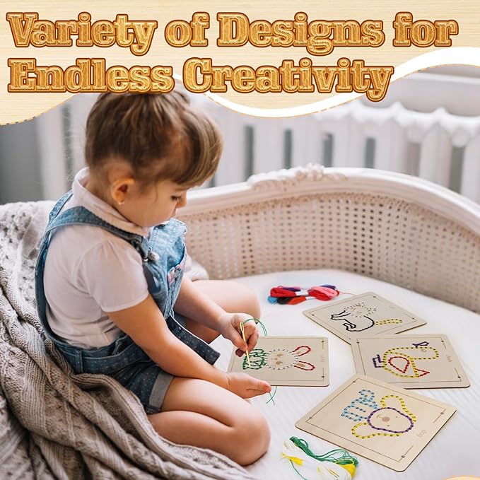 - Sewing Kit for Kids: Featuring 4 unique wooden lacing templates, 10 vibrant colors of yarn, and 4 plastic threading needles, offering a rich hands-on exploration and creative experience. As kids thread the colorful strings through the holes in the wooden boards, they develop hand dexterity, finger strength, and hand-eye coordination. These skills are crucial for future tasks such as writing, buttoning clothes, and using utensils.