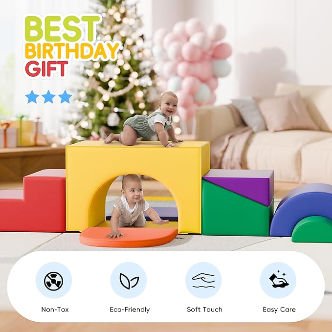 5-in-1 Soft Play Set:Bright blocks assemble into formations to climb, crawl and slide through, building motor skills.The tunnel & incline mat add even more fun. Play motivates movement exploration
