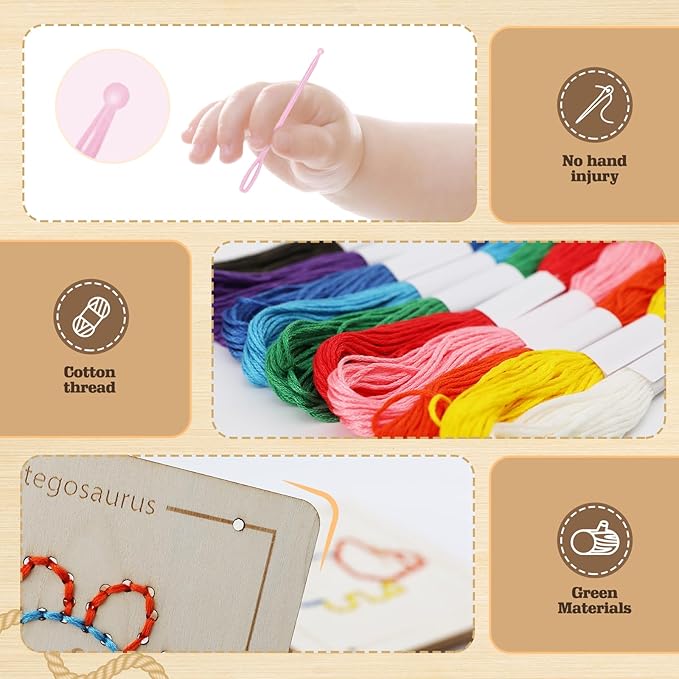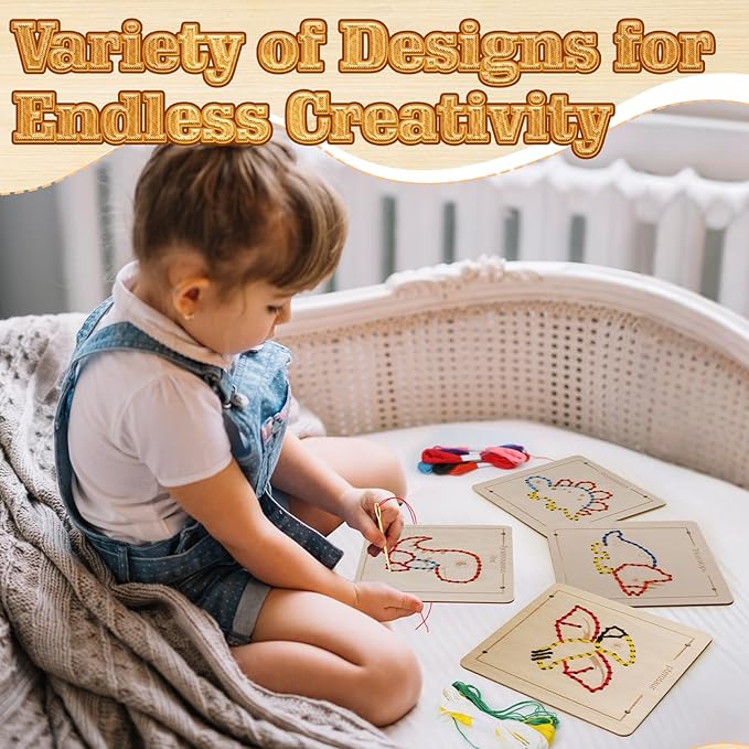 - Sewing Kit for Kids: Featuring 4 unique wooden lacing templates, 10 vibrant colors of yarn, and 4 plastic threading needles, offering a rich hands-on exploration and creative experience. As kids thread the colorful strings through the holes in the wooden boards, they develop hand dexterity, finger strength, and hand-eye coordination. These skills are crucial for future tasks such as writing, buttoning clothes, and using utensils.