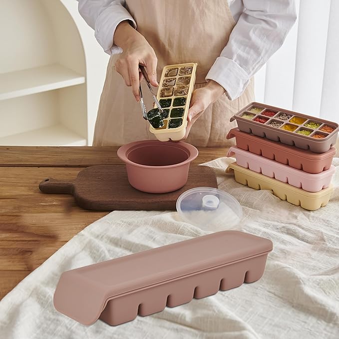 Silicone Freezer Trays with Lid,2ea 0.7oz 12 Cube-Leak Proof Silicone Freezer molds for Homemade Baby Food Breastmilk, Purees, Vegetables, Fruit, Baby Food Jars Ice Tray with Lid BPA Free Beige