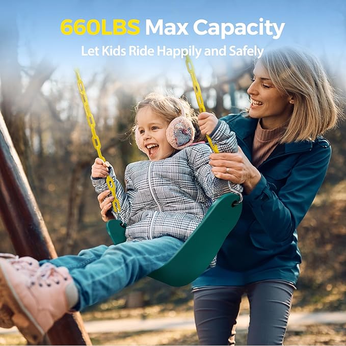 - 【Thickened Soft & Safe Swing Seat】Made of EVA plastic material, our swing seat is soft & strong to let you feel comfortable. It extrudes without deformation and has chemical resistance, corrosion resistance & crack resistance.The thickened swing board is 26 x5.5 inch of U shape. Sitting on it you will wobble more safely and have more fun. The swing set owns safe non-slip designs & lovely color that won't hurt your eyes. It is easy to clean, suitable for girls & boys in outside activities.