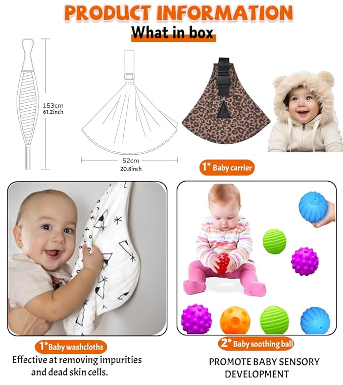 - 【What you get】 : 2 pcs different colors and shapes of toddler sensory ball, there are a variety of ways to play, colorful, more can attract the attention of the baby, 1pcs Baby Muslin Washcloths for Unisex 100% Cotton ,1pcs Convenient travel Baby Sling. is the holiday, Birthday, Thanksgiving and New Year's Christmas gift for your family and friends. Warning: This product is intended to be used with an adult for feeding and/or relaxation under direct adult supervision.
