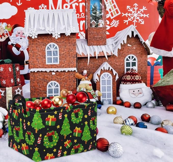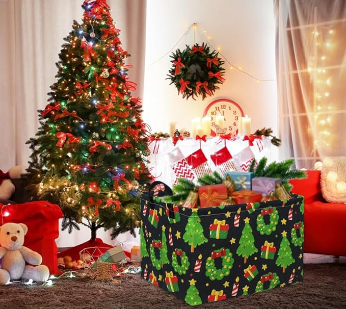 MATERIAL:The christmas basket is made of durable canvas &The inner lining is made of waterproof fabric; sturdy metal rod frame around the top keep the basket shape.