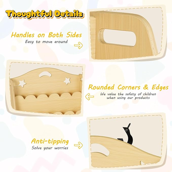 - MATERIAL: This ONBRILL montessori wood kids bookshelf is made of 0.7" thick poplar wood, which is more sturdy and durable than other shelves made of wood chips in terms of structure, it can be used for many years. It is also easy to clean and not easily scratched, simply wipe the stain gently with a damp towel
