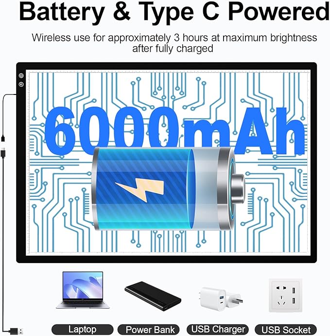 - 【 Built-in 6000mAh Battery 】 Our Upgraded Rechargeable A1 LED lightbox comes with a 6000mAh internal battery which allows you to use it any where without any power source, which makes your project more convenient as well as more enjoyable! Works for around 3 hours at MAX brightness after fully charged 3 hours at a time. This A1 lightpad uses a USB-C interface to easily access any USB port, such as a USB wall charger, computer, laptop or mobile power bank.