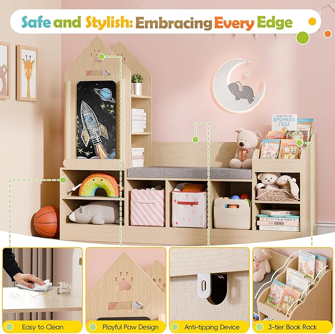 - Ample Storage for Every Need: Designed with versatile storage solutions, including a three-tier house-shaped cabinet, multiple cubbies, and a bench with storage compartments, this bookshelf keeps your child's room tidy and their favorite items within easy reach.