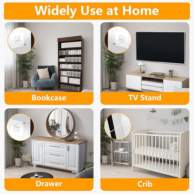 - Wide Applications: Our anti-tip furniture straps can be used for securing various home pieces such as bookshelf, bookcase, cabinet, drawer, dresser, TV stand, wardrobes, leaning mirror, and any baby furniture. Ensure all the heavy and tall furniture around your home can be anchored tightly for a child-safe environment.