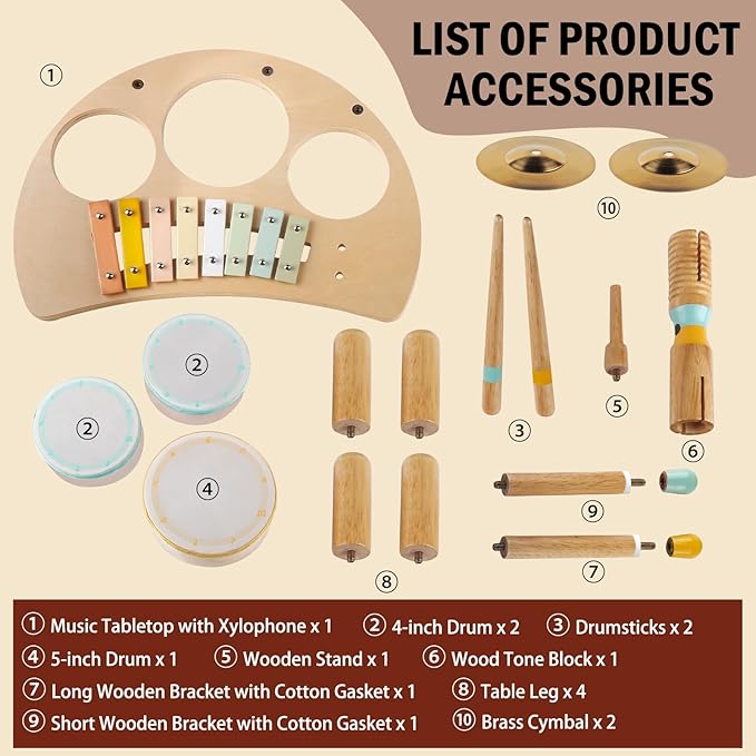 - Neutral Colors Wooden Baby Toys:All the materials and colors of our montessori toys come from nature.These montessori wooden toys can keep baby focused and calm,improving children's concentration. An all-in-one musical instrument featuring 3 drums, 2 drumsticks, 2 cymbals, a sound block and a xylophone. Have 4 stable legs, allowing children to easily play tunes or tap rhythms.