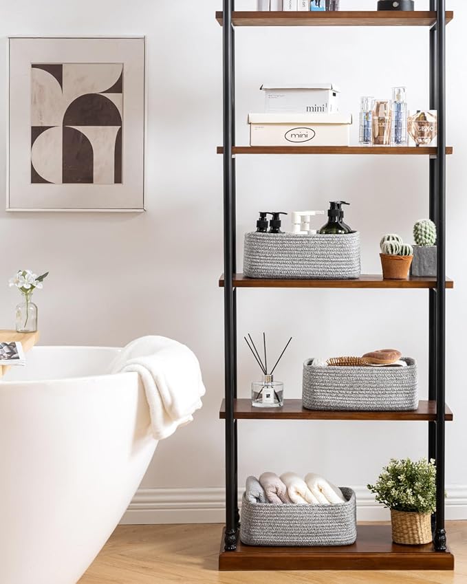 - [ Elegantly Designed to Match Any Décor ] Our small rope basket creates a minimalist appearance, and it adds a touch of warmth and texture to any room. The classic solid color design ensures seamless integration with your existing aesthetics, complementing any decoration. Perfect as decorative storage baskets for shelves, cabinets, and any open display space, making them a stylish and practical addition to any decor, enhancing the overall aesthetics of your room