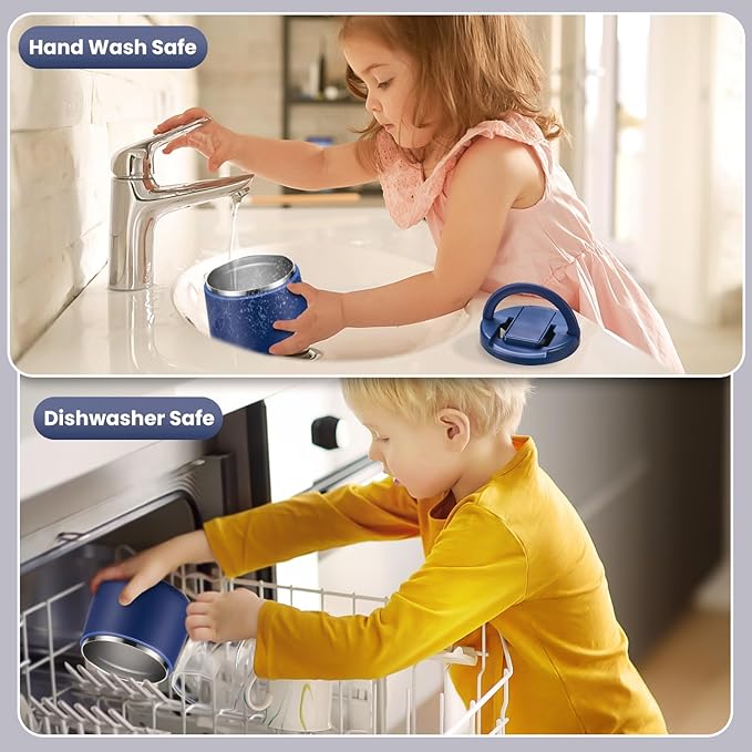 - New Buckle of Lid: The food containers feature a press-seal construction, allowing you to simply pull the handle upwards to 90° to open the lid/ 90° downward closure. This design is maintaining vacuum no need to rotate the lid open . Additionally, the container comes equipped with a carrying handle, making it convenient for your child to carry it. Whether at school, an outdoor outing, or a family gathering, this user-friendly design empowers children to confidently enjoy their delicious meals.