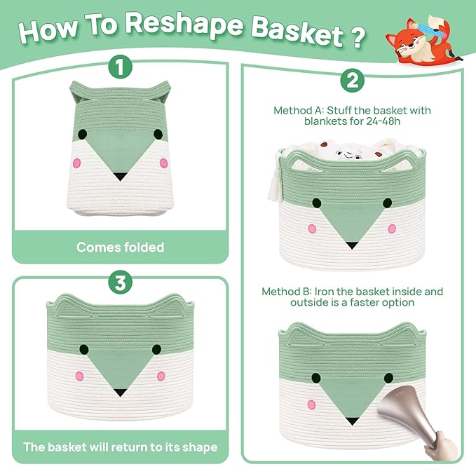 - 【Note】The baby blanket baskets arrive folded, but please don’t worry—this is not a quality issue. You can check out the videos we uploaded. Fill it with blankets and quilt in 24 to 48 hours to make it look round. Then iron the creased places inside and outside the basket. It'll get back to its best shape. This is a basket you’ll use for years. We’ve put a lot of care and love into designing these baskets, and you can trust the quality and craftsmanship.
