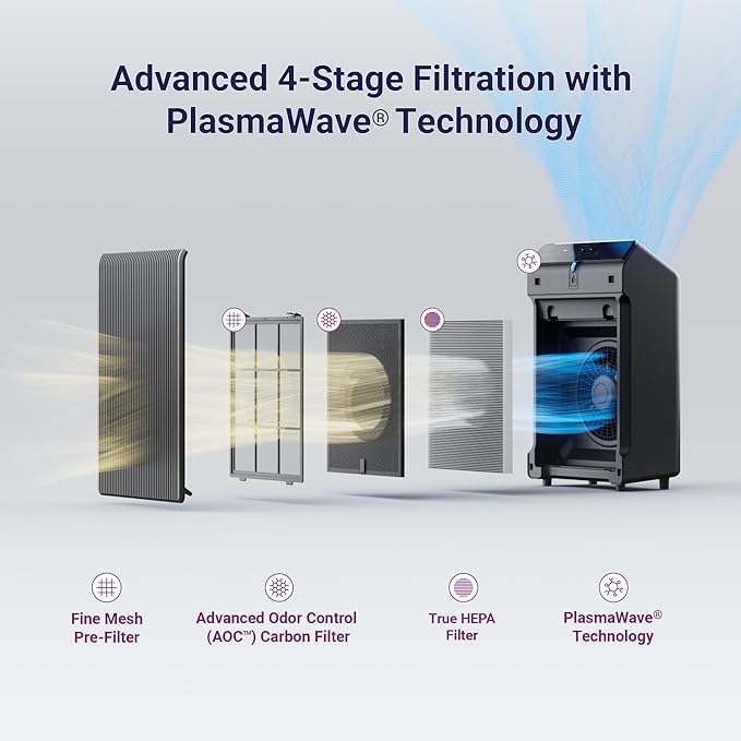 - 𝐀𝐝𝐯𝐚𝐧𝐜𝐞𝐝 𝐎𝐝𝐨𝐫 𝐂𝐨𝐧𝐭𝐫𝐨𝐥 𝐂𝐚𝐫𝐛𝐨𝐧 𝐅𝐢𝐥𝐭𝐞𝐫: Reduces VOCs and household odors from cooking, pets, and smoke. It is designed to catch airborne particles found indoors, which also helps prolong the True HEPA Filter life
