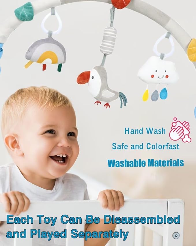 Carseat toys for infants 0-6 months,Stroller toys have variety of graphics,bird built-in wind chime.Cute cloud have rustling.Bullt-in BB squeaker in the Rainbow belly,press to make a Bi~ Bi~ sound.