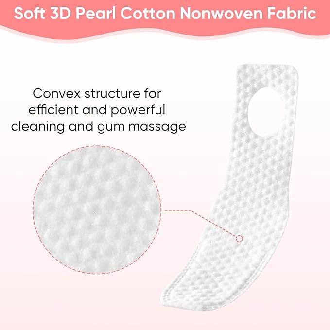 - đăHigh-quality MaterialsăOur baby oral cleaner is made of soft 3D pearl cotton non-woven fabric, which is softer than gauze material and has stronger cleaning power. â„ Using ultrasonic stitching technology, no glue, no chemicals, and will not split. And the bump structure provides efficient and strong cleaning, strong adhesion and better cleaning effect.