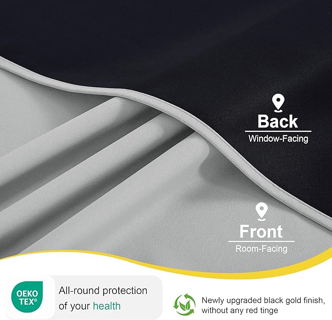- 100% BLACKOUT: These curtains are manufactured in a STANDARD 100 certified by the OEKO TEX factory. The curtains feature triple weaving with black yarn, an extra light-blocking layer, and high-density weaving, which can 100% physical blackout bright sunlight and UV ray, bring you a full room darkening environment for good night sleep, afternoon nap and weekend lie-ins.