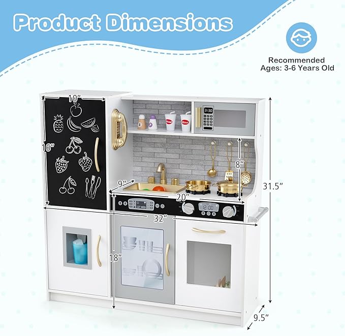 - 【Easy to Assemble】This play kitchen for toddlers comes with included instruction manual in an estimated assembly time of 90 min. Overall dimensions: 32" x 9.5" x 31.5" (L x W x H); Countertop height: 18”.
