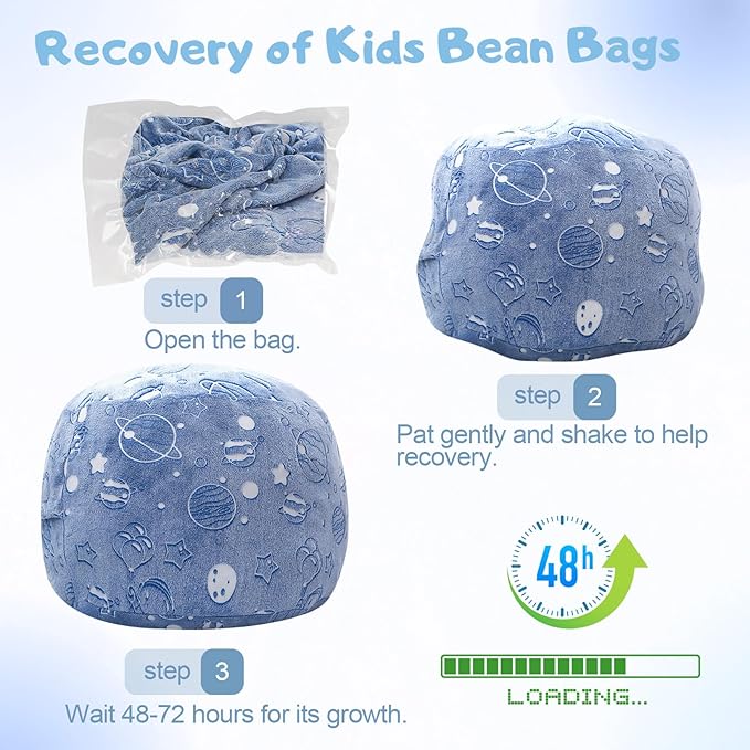 - Inflate 24-72 Hours: The kids' bean bag couch arrives compressed. Shake it initially and continue gently shaking over the next few days to help the filling expand evenly and achieve full rebound