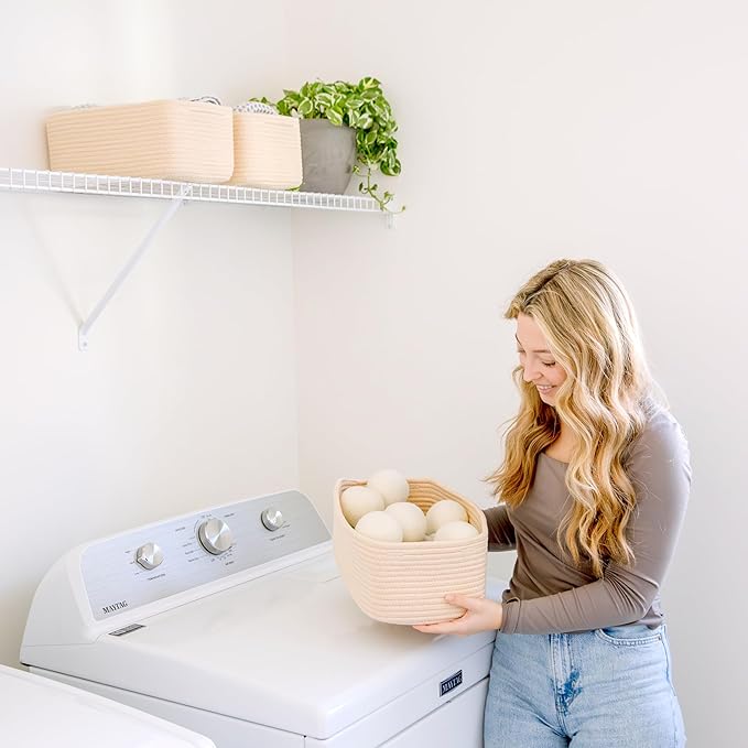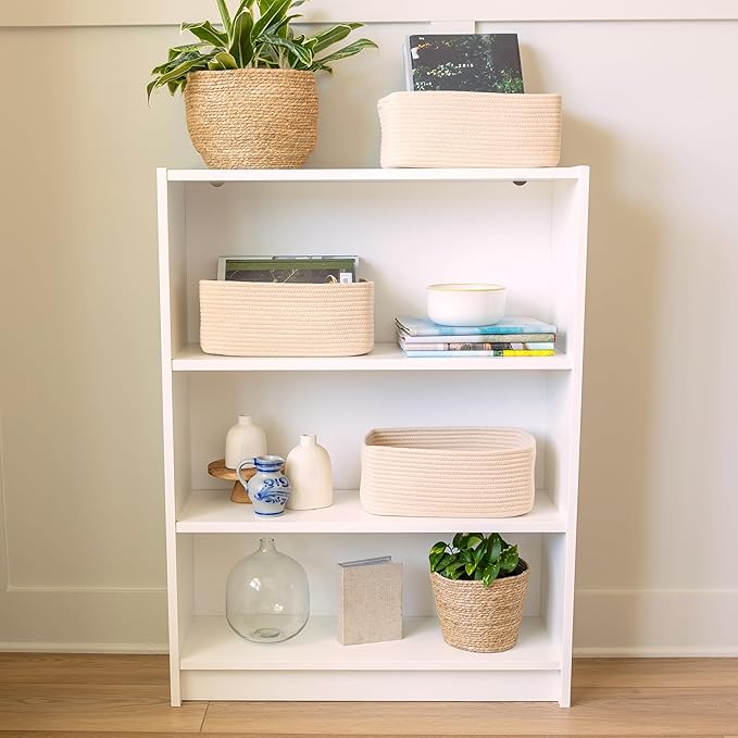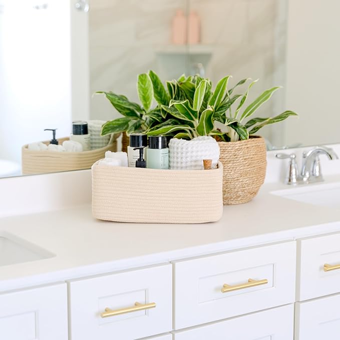 - Safe, Natural Cotton Organizer Bins: Crafted from the highest quality material in the market, our storage bins are oh-so-sturdy (and cute) and ready to take on little humans. They’re 100% safe, so you can rest easy if teething toddlers take a nibble. Reinforced Hidden Handles: Now you see ‘em, now you don’t! With completely hidden handles that blend seamlessly into the rope basket, you’ll be the Houdini of home organizing. They’re even double-stitched and reinforced for extra heavy loads!