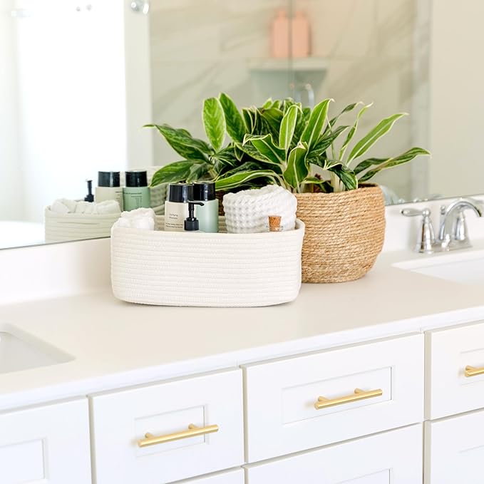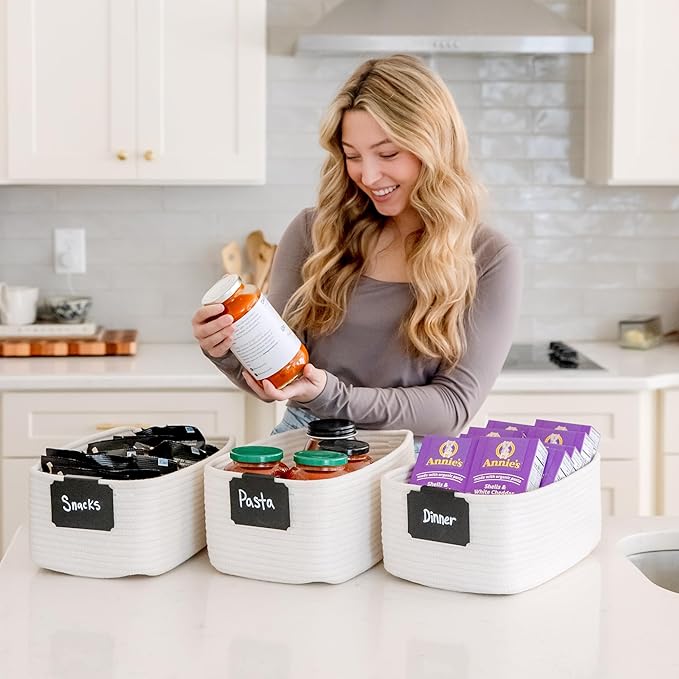 - Safe, Natural Cotton Organizer Bins: Crafted from the highest quality material in the market, our storage bins are oh-so-sturdy (and cute) and ready to take on little humans. They’re 100% safe, so you can rest easy if teething toddlers take a nibble. Reinforced Hidden Handles: Now you see ‘em, now you don’t! With completely hidden handles that blend seamlessly into the rope basket, you’ll be the Houdini of home organizing. They’re even double-stitched and reinforced for extra heavy loads!