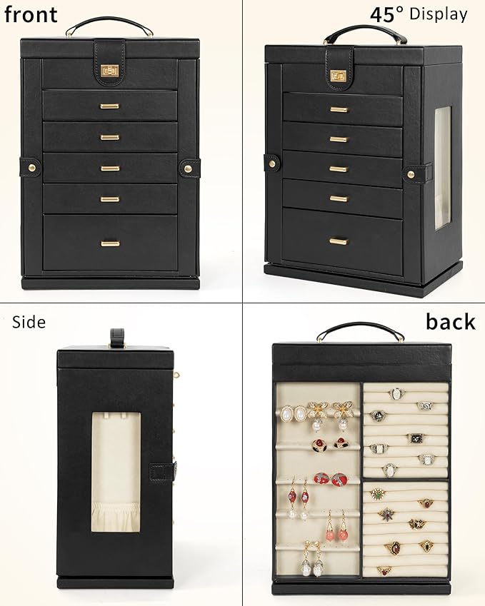 - 【Large Capacity,More Storage Space】With 6 versatile pull out drawers, and additional ring and earring storage at the back,this jewelry box can store a lot of jewelry accessories, such as rings, earrings, necklaces, chains, bracelets and so on. One deeper drawer is designed for watches,sunglasses or large jewelries.Material: Faux Leather,MDF (Medium Density Fiberboard),Velvet,Acrylic