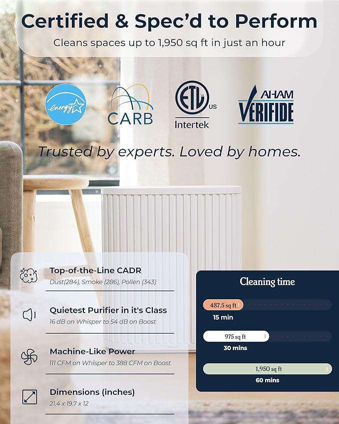 - EFFICIENT COVERAGE FOR YOUR HOME: Perfect for large rooms and open spaces, this air purifier cleans up to 1,950 sq. ft., making it ideal for all room types. With a CADR of up to 309, it can provide consistent and powerful air purification across large spaces.