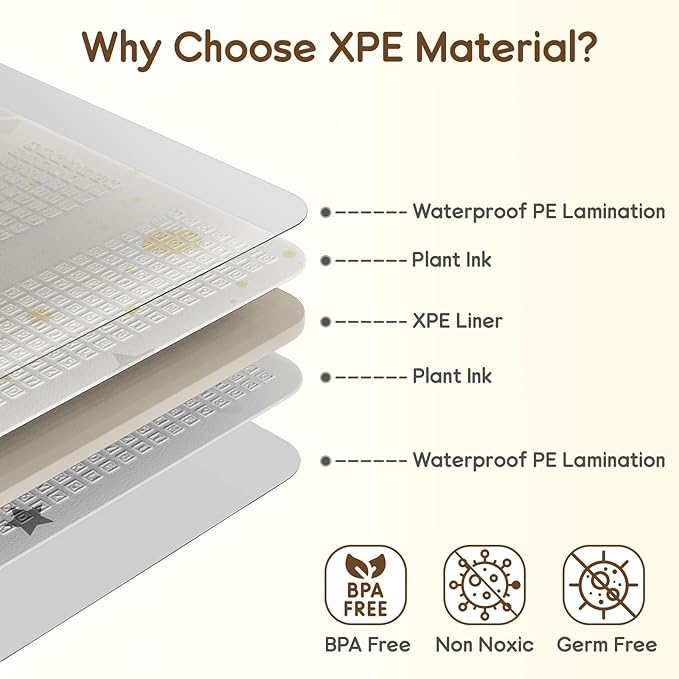 - WATERPROOF & EASY TO CLEAN: The surface of this crawling mat is 100% waterproof, water and milk stains will not soak the mat, what you need to do is wipe it with a damp towel to keep the playmat for the floor clean as new.