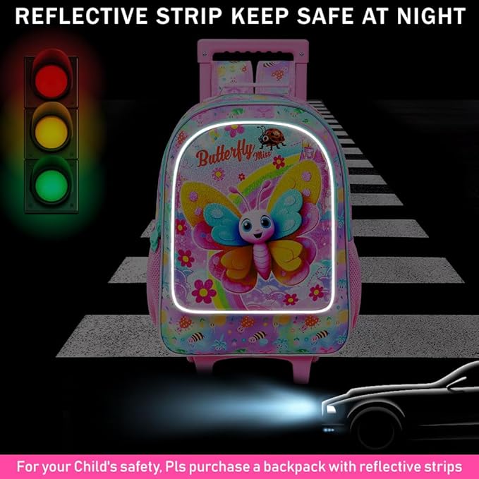 - Eye-Catching Design: This girl rolling backpack is made of new uv printing technology, interesting and fun, the cute butterfly shines. The high quality eco-friendly water-resistant fabric makes kids wheeled backpack perform better.