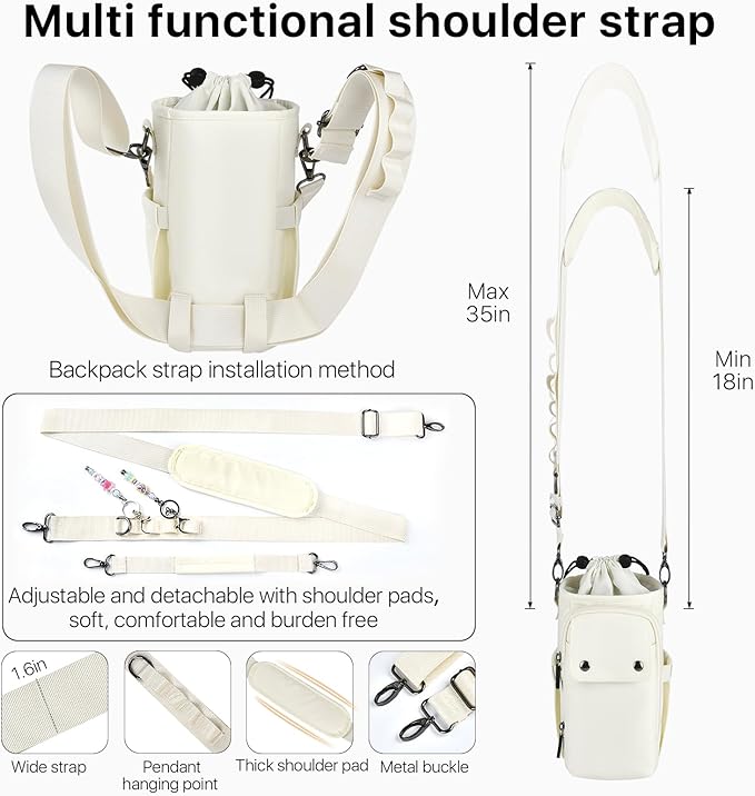 - Multiple Ways of Carrying: water bottle pouch is equipped with a removable and adjustable wide shoulder strap and handbag strap, shoulder strap (size can be adjusted from 36in to 69in, 1.6in wide with an enlarged shoulder pad, plus multiple hanging points, Metal fasteners), 1 shoulder strap can be changed from cross body to double-shoulder, which can be used as cross body bags, backpacks, shoulder bags and handbags, suitable for all body shapes to meet your needs. Long time traveling to carry.